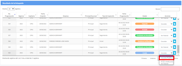 La programación de las visitas de seguimiento puede ser modificados cuando se encuentran en estado "Creación". Para modificar una programación, diríjase a la columna acciones y seleccione la opción "Consultar/Modificar", finalice dando clic en el icono representado por una mano.