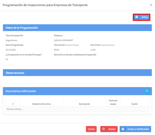 El sistema le mostrará la ventana con el detalle de la programación y los campos habilitados para modificar. De clic en “Editar”.