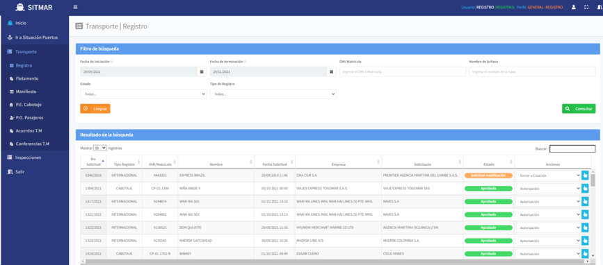 En el módulo Registro, del sistema de transporte Marítimo nacional e intencional usted podrá: