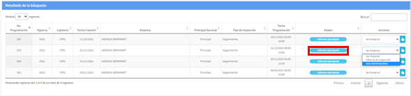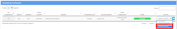 La opción de resultados de la búsqueda en el módulo de Inspecciones cuenta con unos parámetros que facilitan su modificación. Usted puede aprobar la evaluación de la visita al inspector a través de la opción “Aprobar evaluación” de la columna acciones y de clic en el icono representado por una mano.