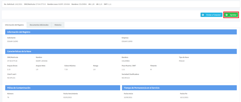 El sistema lo enviará al formulario de registro que creo la agencia. En la parte superior de la pantalla se encuentra el botón "Aprobar". De clic en el botón correspondiente.