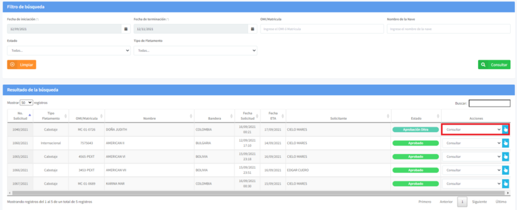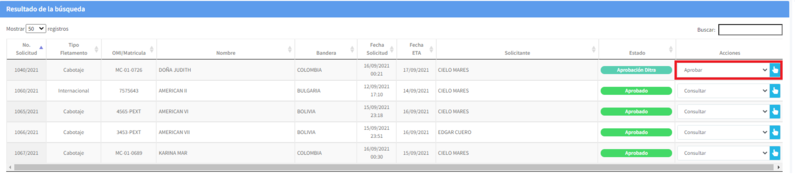 El sistema le mostrará el formulario con la información completa de la solicitud de fletamento. En la parte superior de la pantalla, usted encontrará el botón "Aprobar".