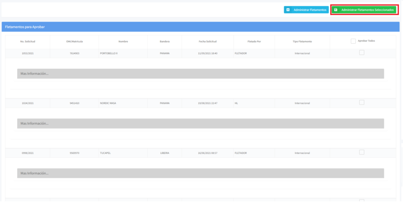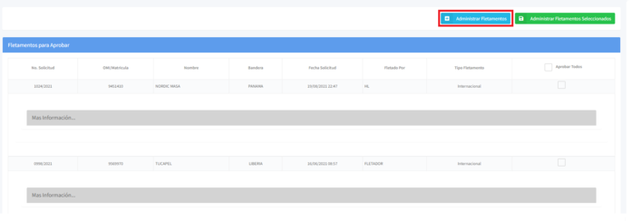 Opción 1: De clic en la opción Fletamento del menú principal. El sistema le mostrará un resumen de las solicitudes de fletamento que están pendientes por aprobar. Esta opción le permite aprobar fletamentos de manera masiva, haciendo clic en la casilla de verificación "Aprobar todos", o seleccionando uno a uno. Finalice dando clic en el botón "Administrar fletamentos seleccionados", que encuentra al final de la pantalla.
