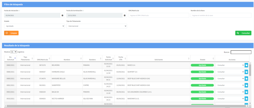 El módulo de Fletamento, del sistema de transporte Marítimo nacional e intencional, cuenta con unos parámetros que facilitan la búsqueda de solicitudes. Usted puede realizar la búsqueda por uno o mas criterios.