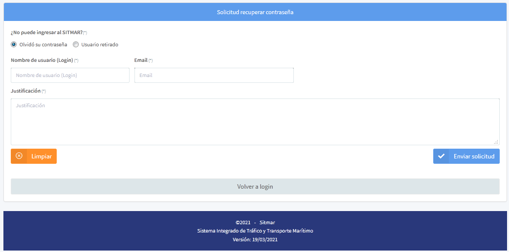 1. ¿No puede ingresar al SITMAR? : Se le presenta al usuario las opciones de respuesta Olvido su contraseña y Usuario retirado. Seleccione la opción según sea el caso